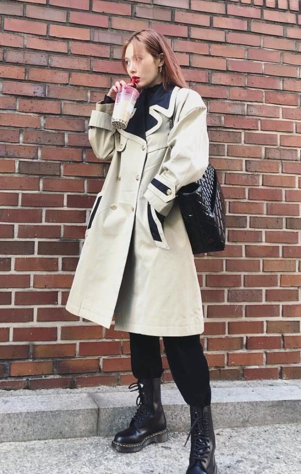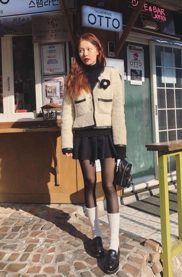 金泫雅很喜欢秀美腿,不管是光着腿的,还是穿保暖裤(丝袜)的样子,都是很好看的。这双橘红色的中筒靴很有特色,很显眼很有个性,搭配黑色保暖裤,凹出让人羡慕的“牙签腿”。