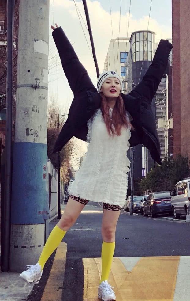 金泫雅算是中筒袜的“忠实粉丝”了, 这次选择的是黄色的中筒袜,搭配白色老爹鞋,有一种小清新的感觉。鲜艳的黄色很吸睛,瞬间就吸引了人们关注的目光。而且“露袜子”的穿法很火,也可以修饰腿型,更显优美的线条。