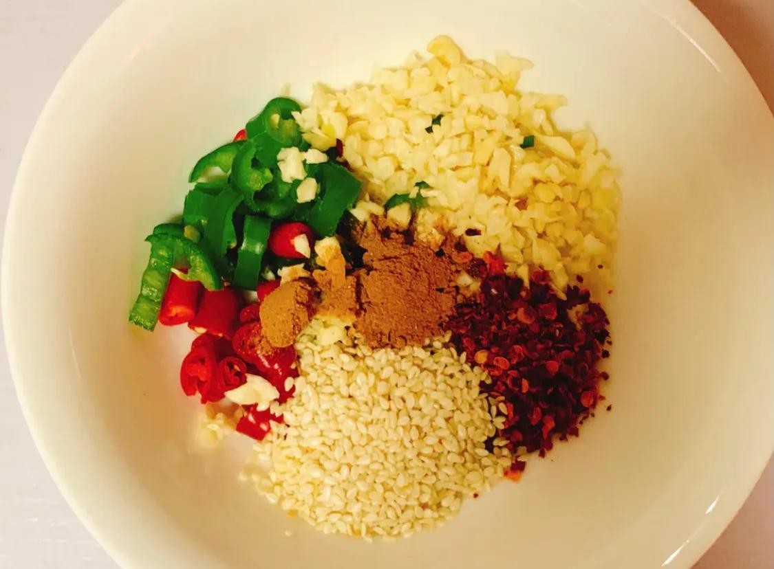 准备蒜末,白芝麻,小米辣,青椒,五香粉,辣椒面。