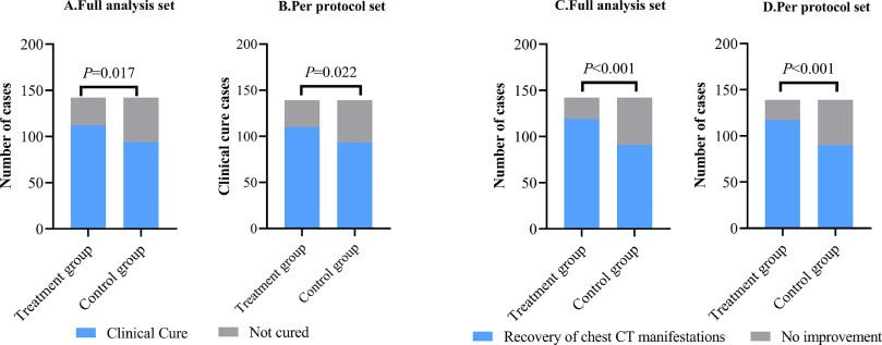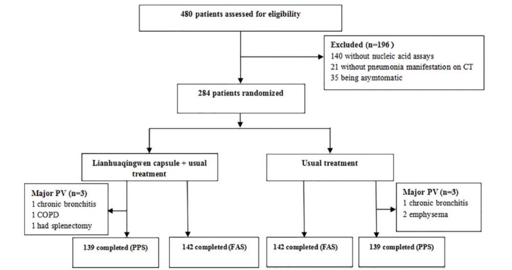 研究纳入了284例患者,他们被随机分配接受单独的常规治疗或常规治疗与连花清瘟胶囊的组合(连花清瘟治疗组和对照组各142例)。