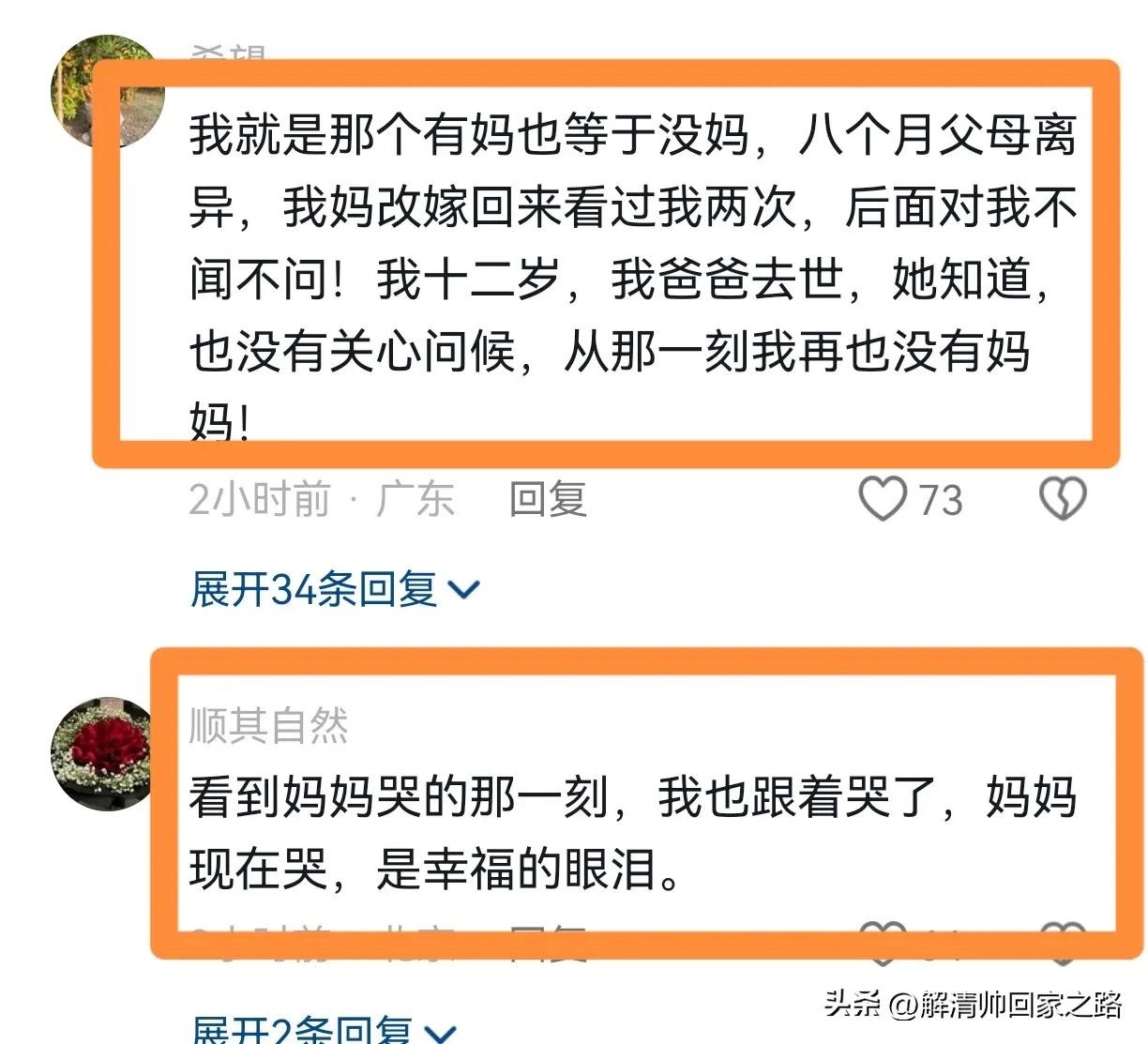 网友@希望: 我就是那个有妈也等于没妈,八个月父母离异,我妈改嫁回来看过我两次,后面对我不闻不问!我十二岁,我爸爸去世,她知道,也没有关心问候,从那一刻我再也没有妈妈!