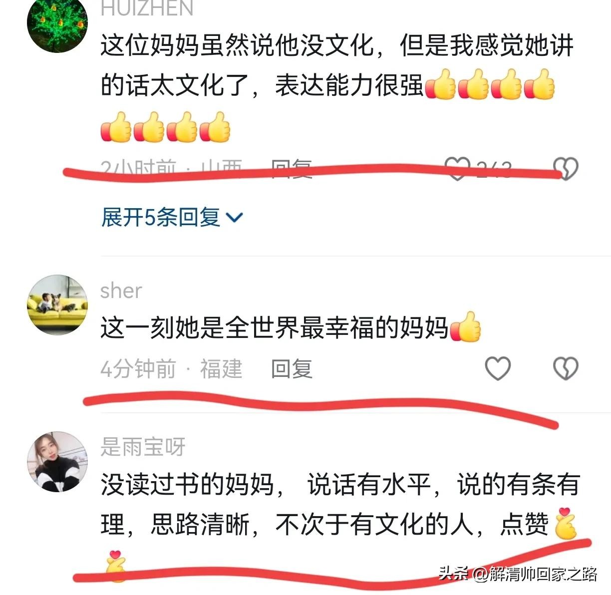 网友@HUIZHEN: 这位妈妈虽然说他没文化,但是我感觉她讲的话太文化了,表达能力很强
