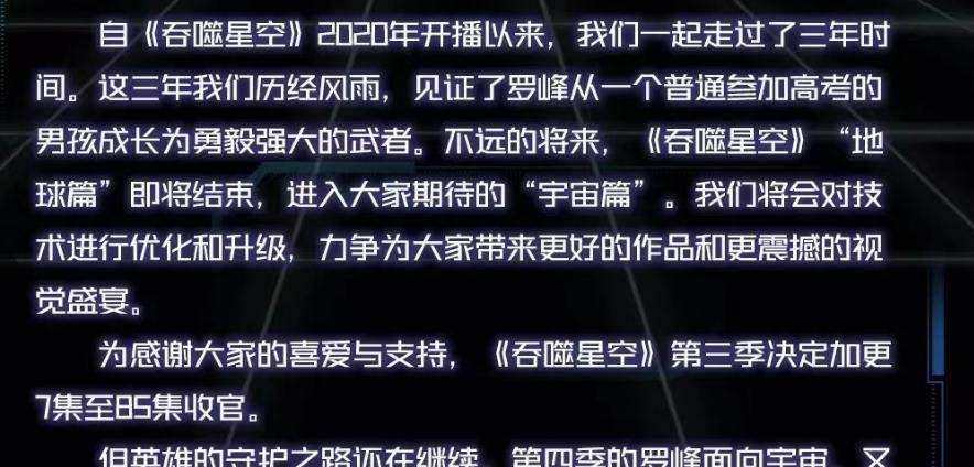 大家好,今天我想和大家聊一聊《吞噬星空》这部国漫。近期,第85集已经播出,但突然之间官方宣布停更,这一决定引发了观众们的不满和疑问。很多人纷纷批判官方,认为他们的解释不够令人满意。本文将为大家解析吞噬星空停更事件的背后原因以及观众和官方的争议。