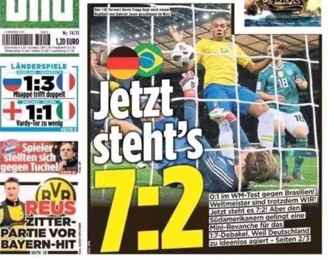 不久前结束的热身赛,巴西队1比0小胜德国队,但是德国人似乎并没有因为这场失利而重视巴西,反倒嘲讽了起来,德国媒体《图片报》更是在头版上大肆标注“现在是7比2领先”。2014年那场7比1大胜,让他们现在仍在沾沾自喜,而巴西队似乎就要一直被嘲笑下去。