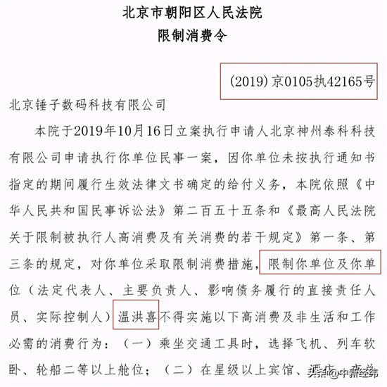 此外,北京锤子数码科技有限公司及公司(法定代表人、主要负责人、影响债务履行的直接责任人员、实际控制人)温洪喜曾收“限消令”。案号同样为(2019)京0105执42165号。