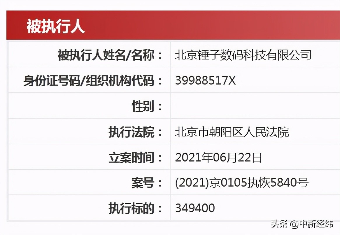 中国执行信息公开网显示,2021年6月22日,北京锤子数码科技有限公司新增被执行人信息,案号(2021)京0105执恢5840号,执行法院为北京市朝阳区人民法院,执行标的349400。