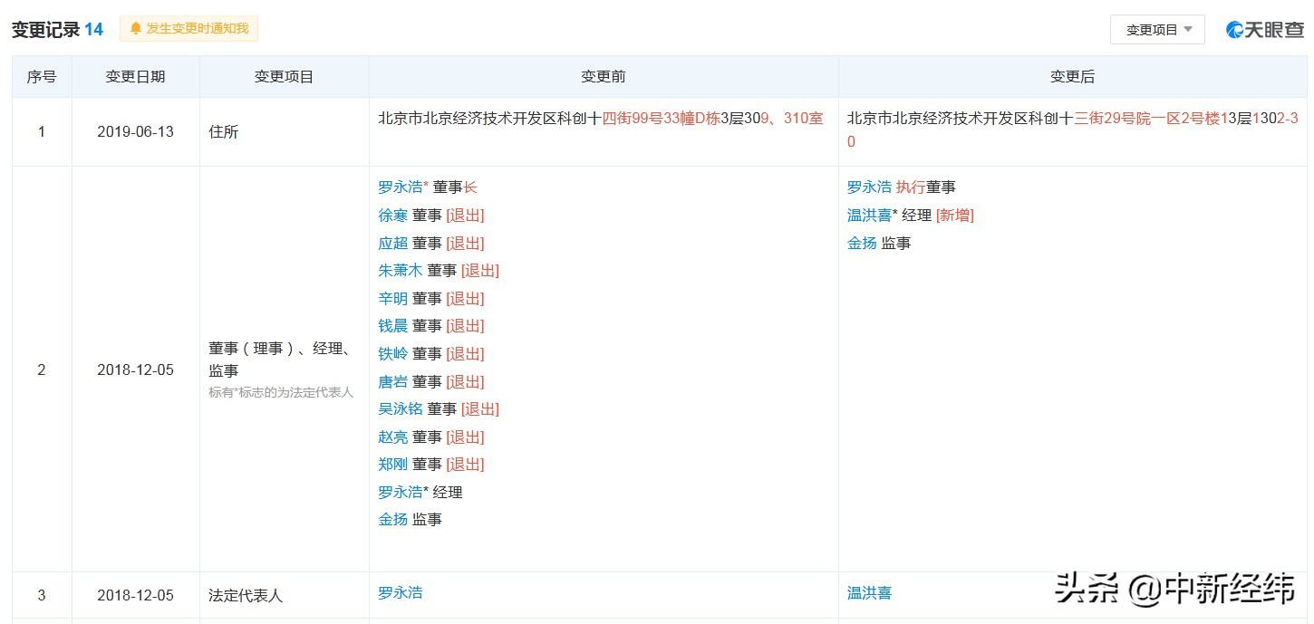 天眼查App显示,2018年12月5日,罗永浩由北京锤子数码科技有限公司董事长变更为执行董事,新增温洪喜担任经理;同日,该公司法定代表人也由罗永浩变更为温洪喜。(中新经纬APP)