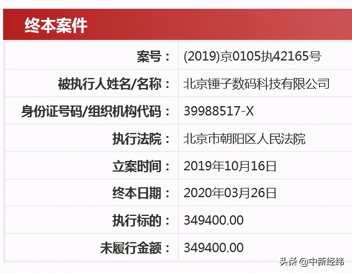 中新经纬客户端注意到,据中国执行信息公开网此前披露,2019年10月16日,北京锤子数码科技有限公司被列被执行人,案号为(2019)京0105执42165号,执行标的同样为349400。该案件终本日期为2020年3月26日,未履行金额349400。