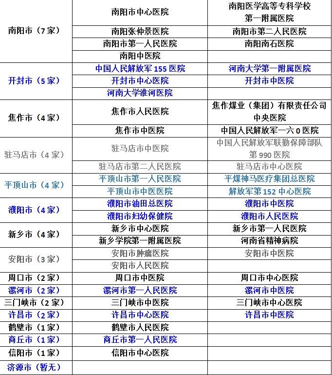 作为省会城市,郑州市的医疗实力在省内一家独大,拥有21家三甲医院,远远高于省内其他城市;第二梯队是洛阳市和南阳市,各有7家三甲医院;第三梯队是开封市、焦作市、驻马店市、平顶山市、濮阳市、新乡市,除了开封市拥有5家三甲医院,其他都是4家;第四梯队是安阳市、周口市、漯河市、三门峡市、许昌市、鹤壁市、商丘市、信阳市,大部分为1—2家三甲医院,济源市暂无查到。