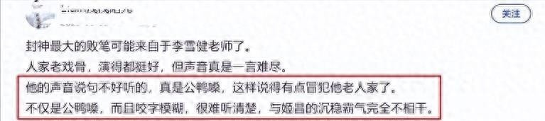 但随着电影的走红,围绕着李雪健的负面新闻却纷至沓来,其中最引人注目的便是他被形容为“封神中最大的败笔”的“塌房”事件。事情的始末似乎很简单,在拍摄《封神》期间,李雪健坚持使用自己的原声演出。作为一名老戏骨,他一直秉持着自己上阵不用配音的原则,但这一决定引发了广泛争议。