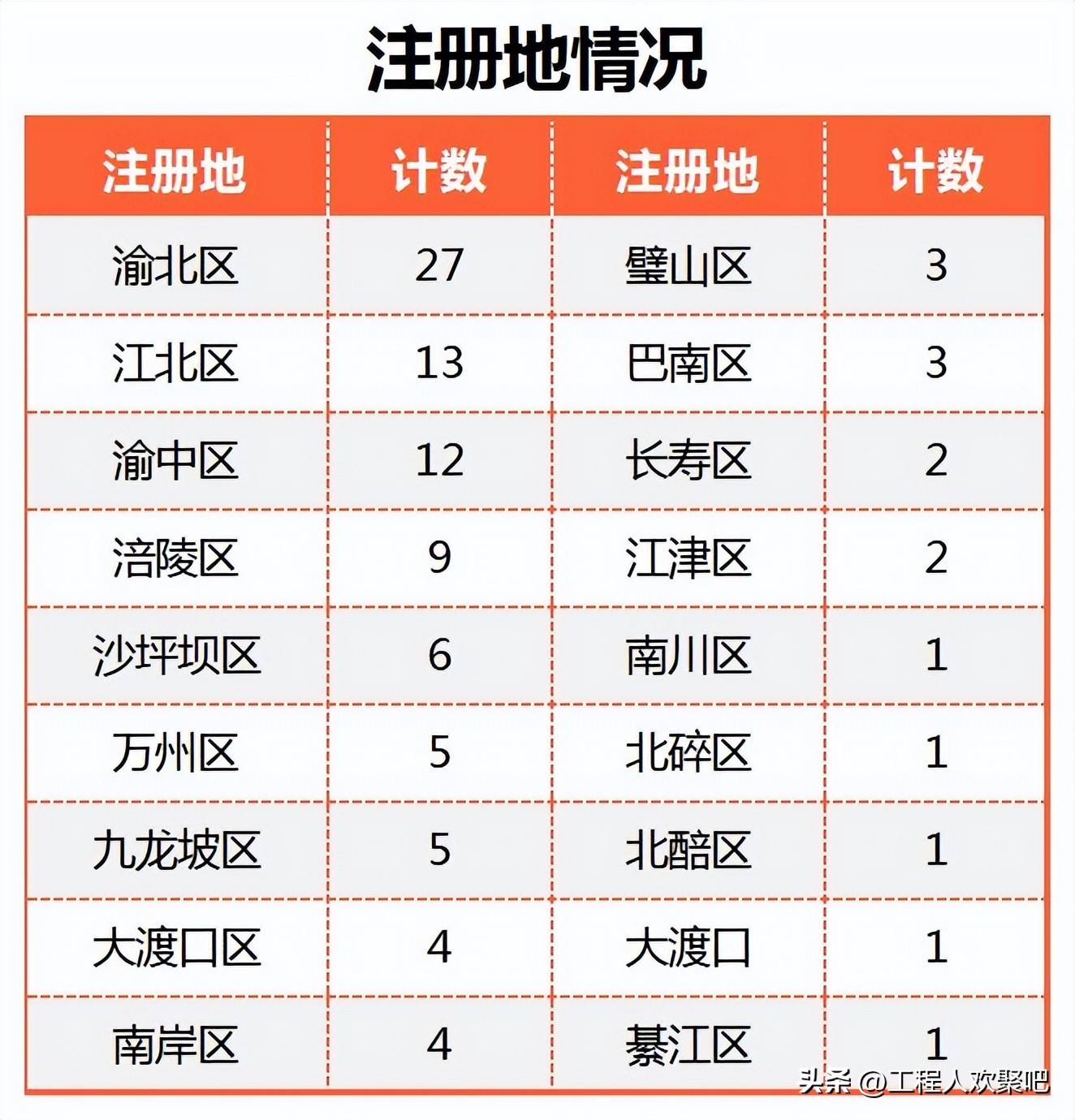 本榜单由来自18个区县的企业组成,其中渝北区上榜27家高居榜首;江北区上榜13家企业居次席;渝中区上榜12家居第3位,其余企业上榜数均为个位数,前三个区上榜企业就超过总榜单一半以上。详见下表: