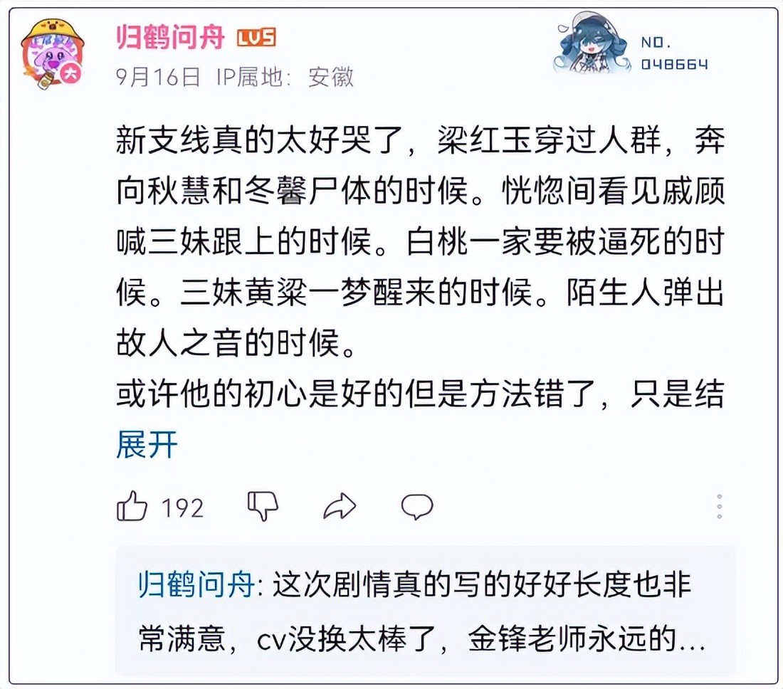 【六州歌头】,又成为神级支线,因为代入感太强,玩家心情一时难以平复。