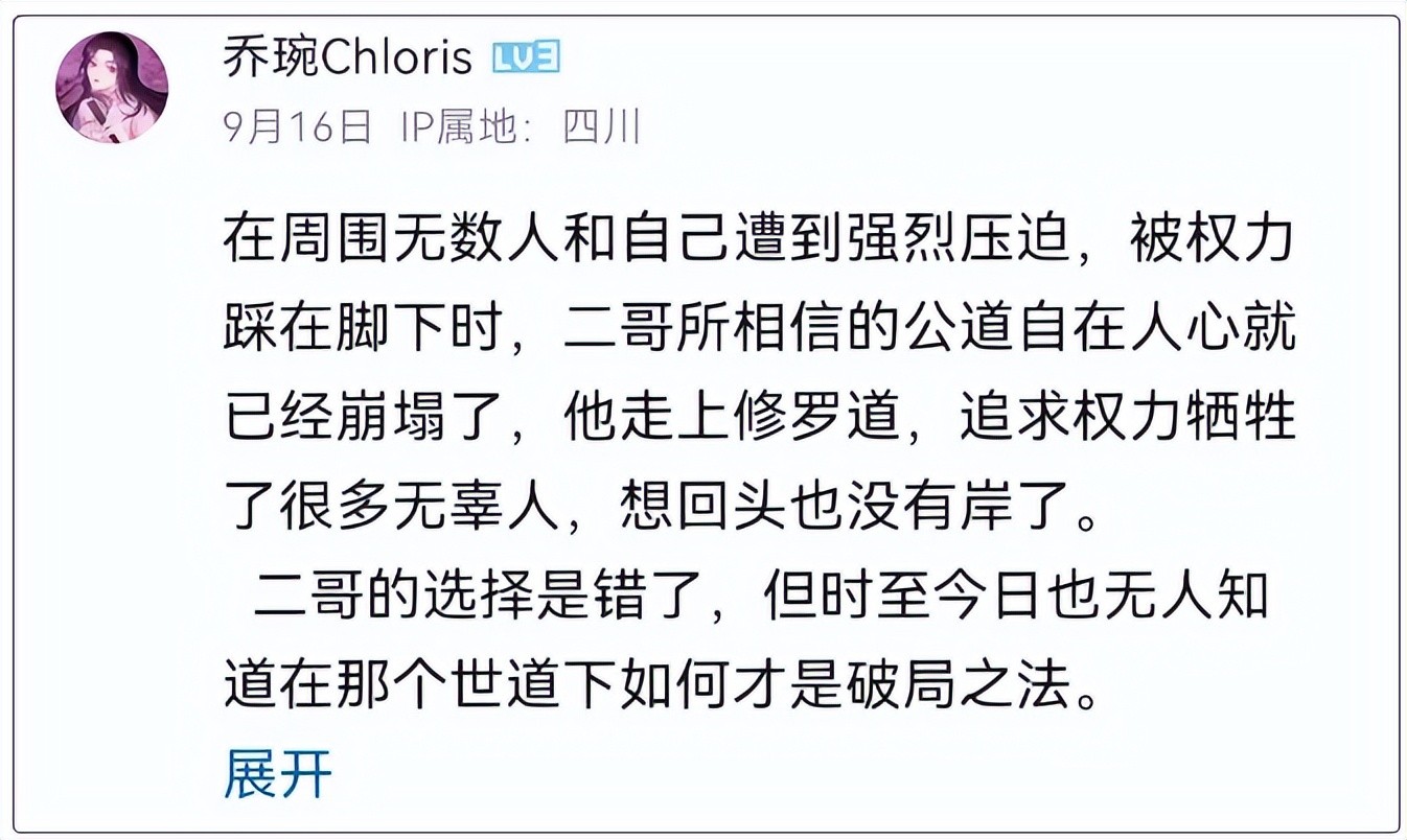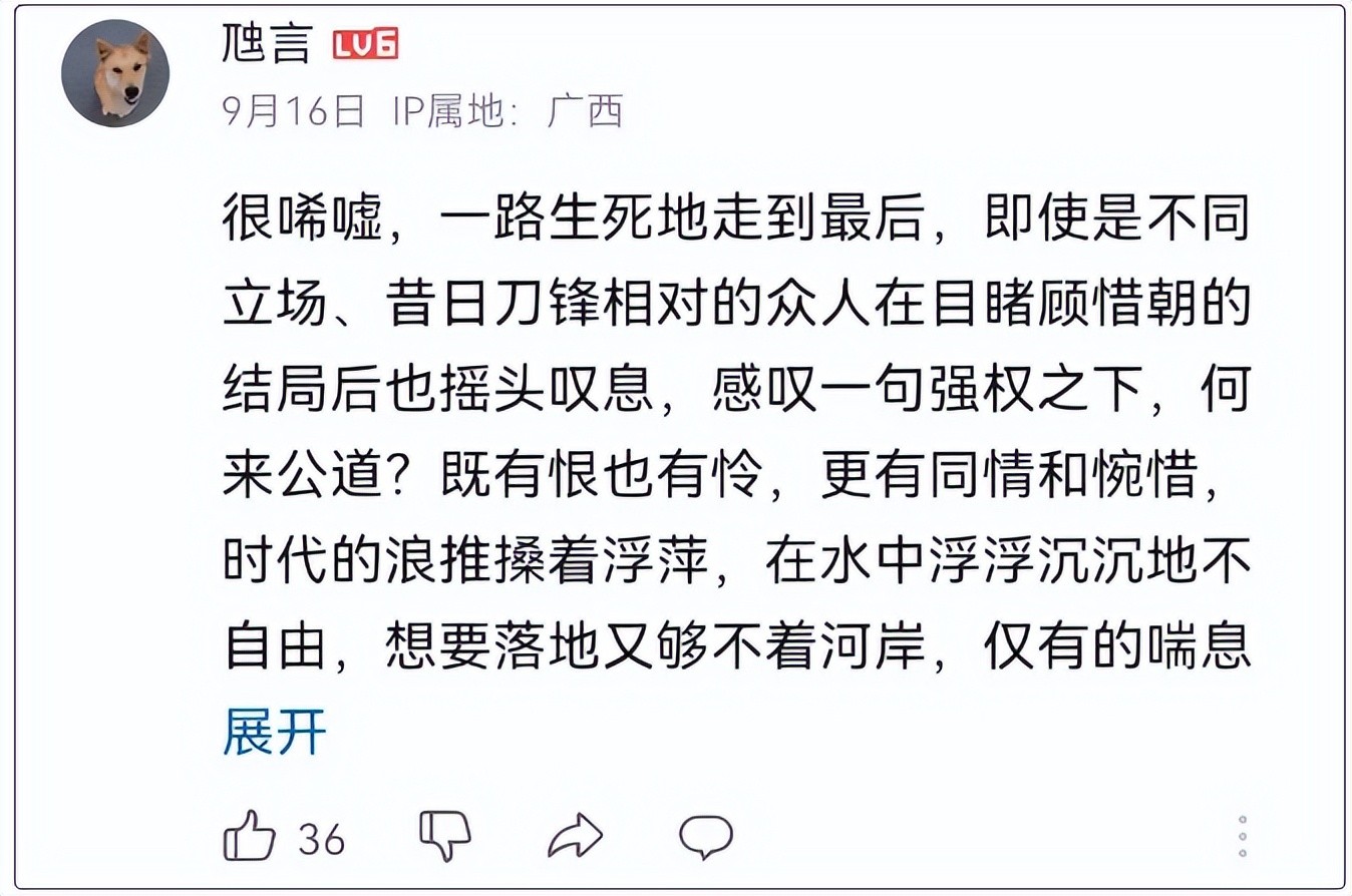 还有人发表看法:二哥是选择错了,但是时至今日,我们依然找不到在那个世道之下的破局之法。