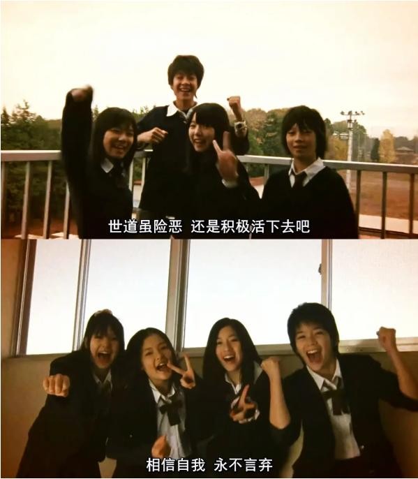 清澈镜头、抒情音乐、纯净无垢的喧闹、微笑以及干净的校服,这是我对电影的第一印象。唯美的慢放,美丽的幻想,天空大片云朵飘过的延时,看起来就像是一个两小时的MV。大概这是日本残酷青春电影最典型的特征——美与丑的并存,温柔与尖锐的同行,轻快与痛苦的相伴,用最浪漫的色调与音乐让人看到最残忍最悲哀的画面。这样的反差大概最讽刺吧。