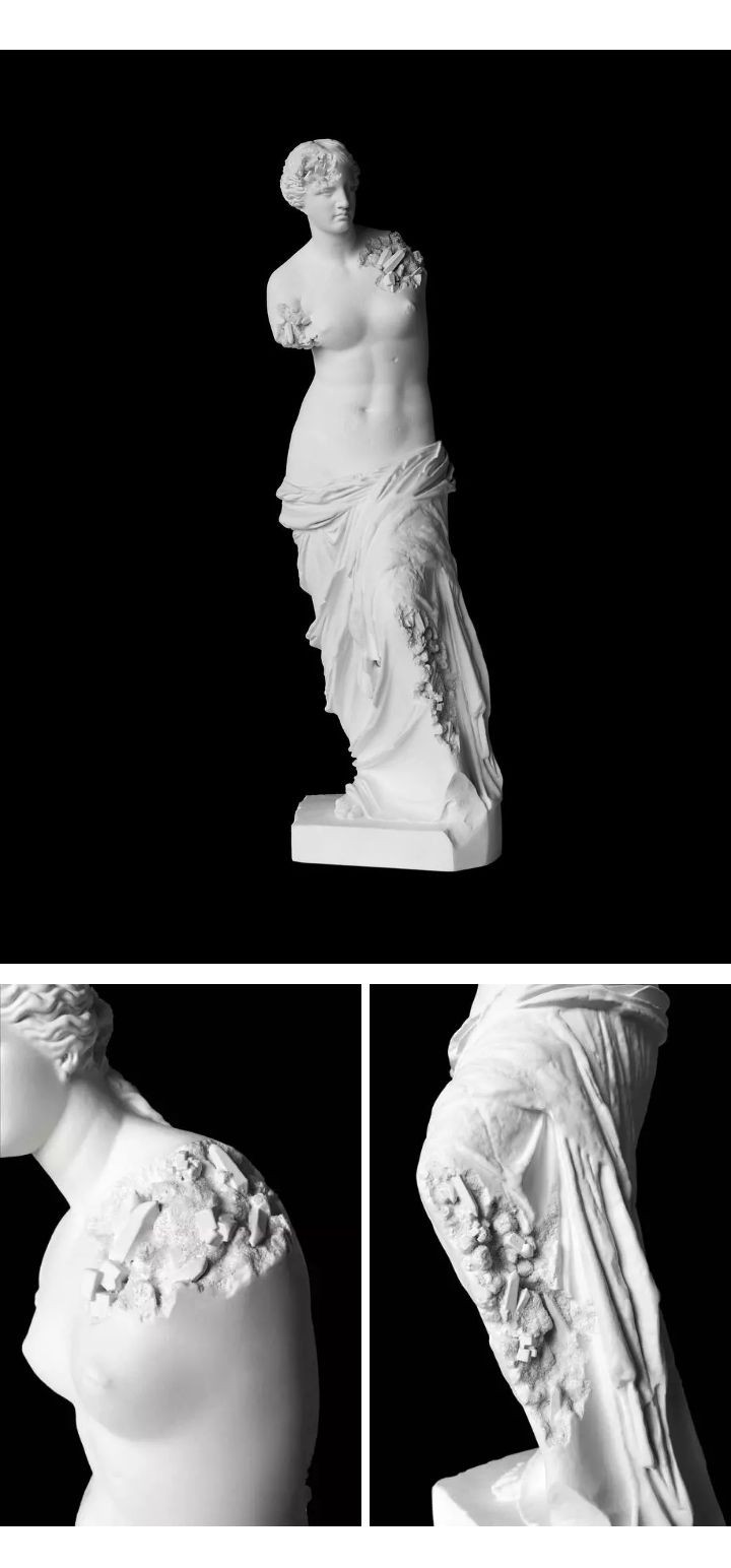 知名艺术家Daniel Arsham就以断臂维纳斯为主体进行创作,给已经断臂的维纳斯带来了自己独有的艺术效果,侵蚀的质感!
