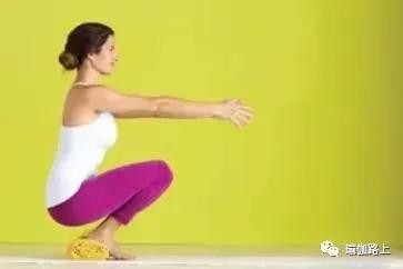 双脚并拢,下蹲脚跟踩在卷起的毛毯上双手往前延展,和地面平行保持背部延展保持10次呼吸