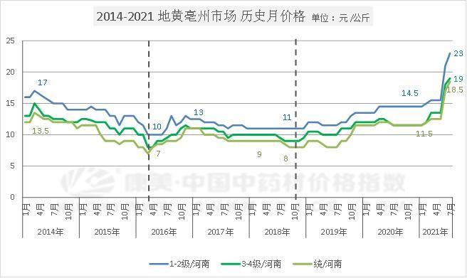 2021年4月时,产区4级以下混等13元,3-4级混货13.5-14元之间,人气旺盛,后传出今年种植规模未有增加;5月开始随着购货商家有增,行情较前期坚挺又显上扬,亳州市场三四级货15.5左右,混级货价在14.5元左右;熟地统货价在16-17元;直到7月初,产地以每周2元左右的幅度上涨,后高位企稳;7月下旬的河南产区罕见暴雨,各种猜测之下地黄关注度跃居到市场第一,行情继续上扬,市场和产地出现惜售现象,混级货要价23元左右;熟地统货25元左右。