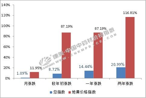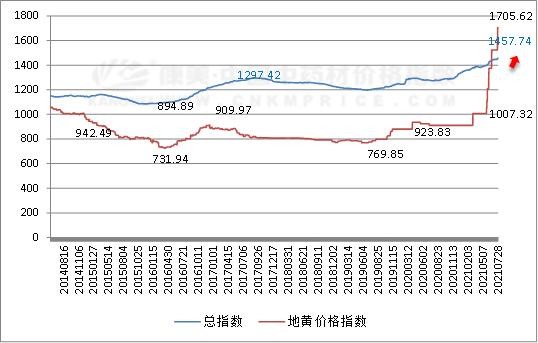 与前年同期(2019年7月28日)相比,上涨了116.81%,比上年同期(2020年7月28日)上涨了87.19%。同期,总指数分别上涨20.99%,上涨14.44%。地黄价格指数涨幅明显大于总指数。