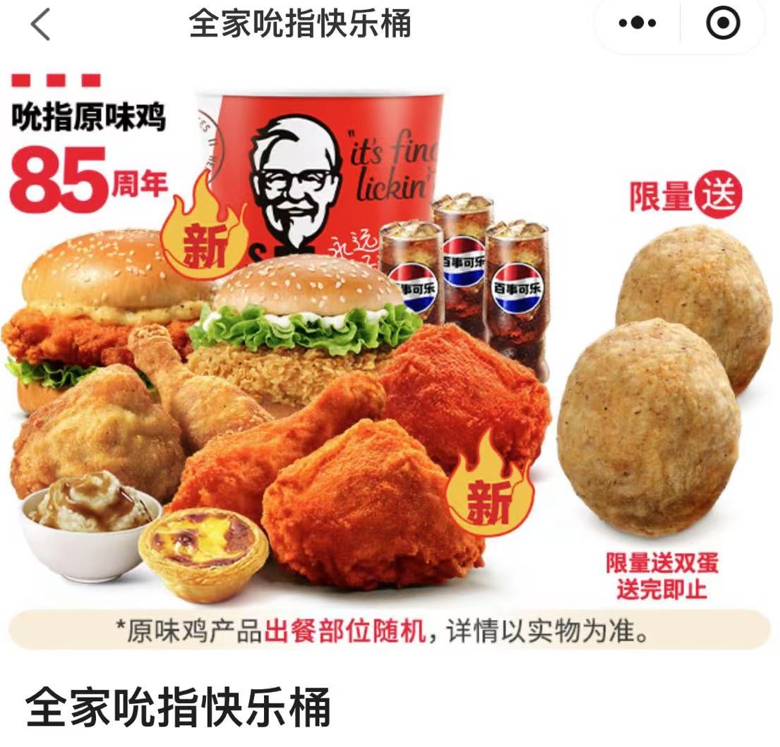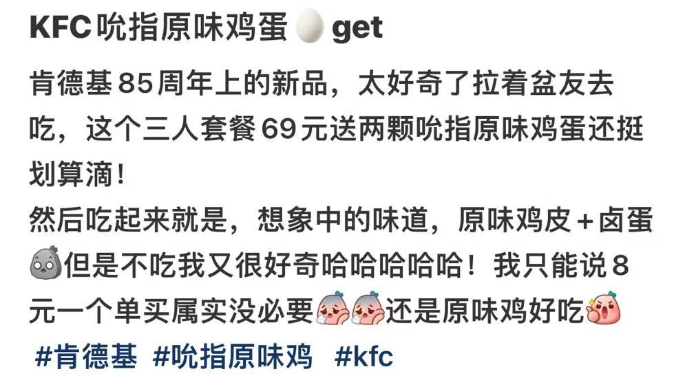 好消息是,因为85周年活动,现在购买69元的“全家吮指快乐桶”,肯德基会送两个蛋。而且在吮指原味鸡的光环加持下,“吮指原味鸡蛋”产品溢价上更有空间。即使8.5元买一个鸡蛋,也有大批人一边觉得离谱一边又想试试口味了。