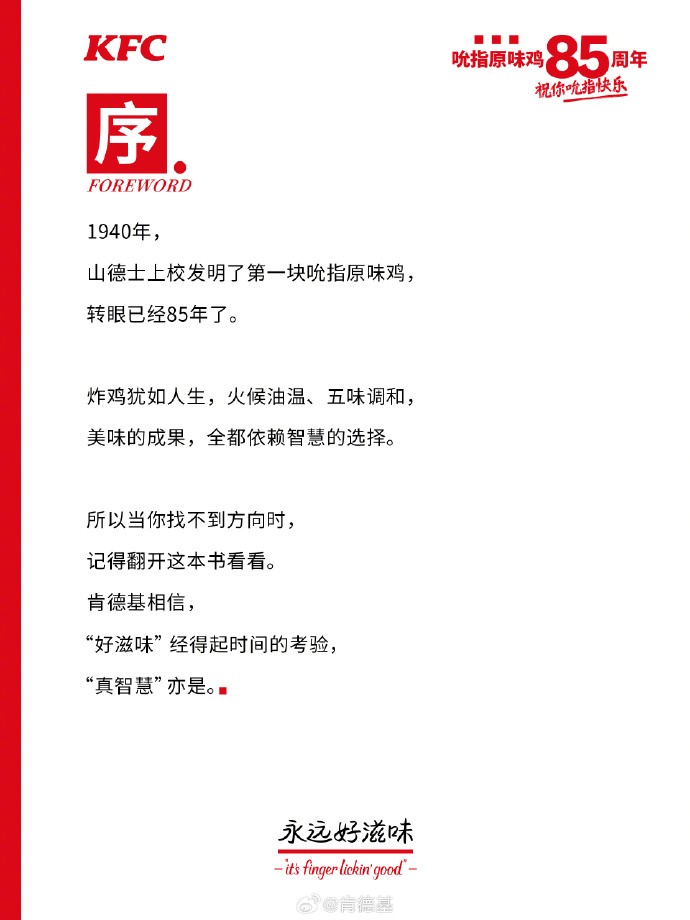 据85周年宣传海报,1940年山德士上校发明了第一块吮指原味鸡。长久以来,“吮指原味鸡”在消费者心中的地位不可估量。