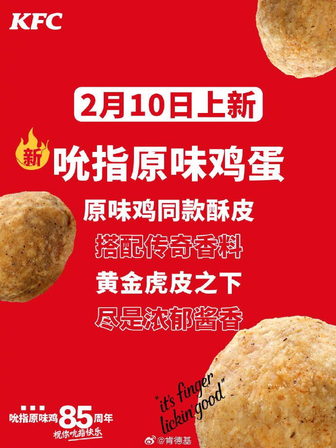 为纪念吮指原味鸡热销85年,今日肯德基上架新品“吮指原味鸡蛋”,售价8.5元一个。上架不过短短半日,‘这一“抽象”新品便引来热议。不少网友直呼:新年开工的第一个震撼,是肯德基给的。