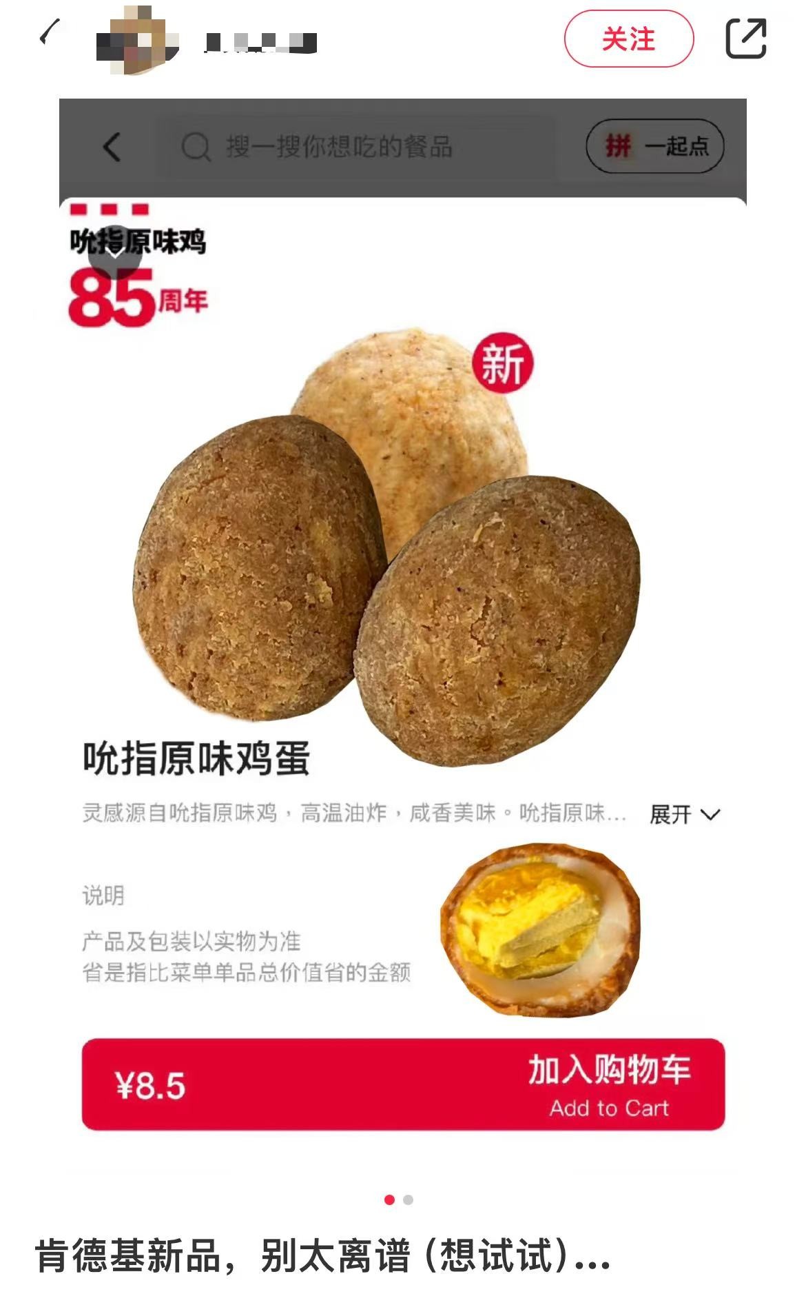不过,一个小小的鸡蛋经过肯德基的改造,身价却迎来暴涨。据网友反馈,“吮指原味鸡蛋”售价8.5元一个。面对这一天价,哪个“肯门”能淡定面对?