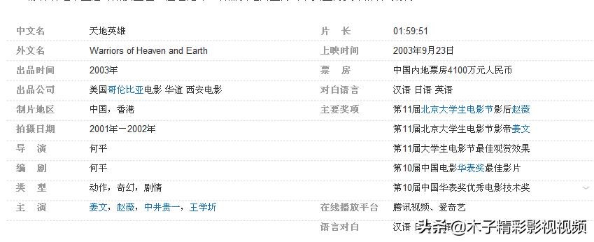 《天地英雄》是一部由何平执导,姜文、中井贵一、赵薇、王学圻主演的动作片,由美国好莱坞哥伦比亚电影制作、华谊和西安电影联合出品,于2003年9月23日上映。影评讲述了盛唐时期发生在一位逃犯与一名捕快之间互为对手又互为英雄的传奇故事。