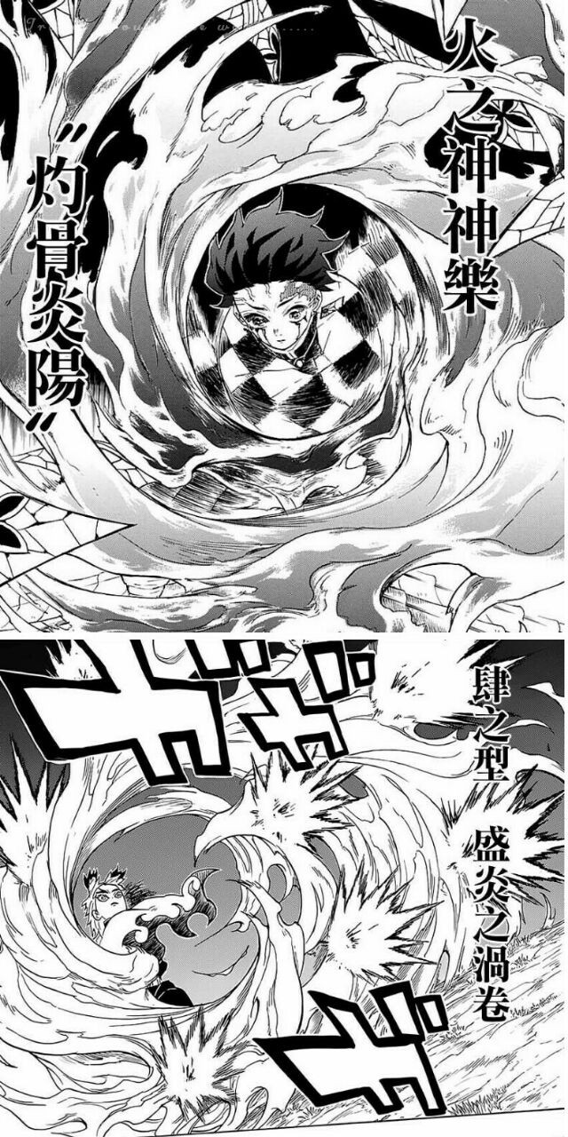 其二,火之神神乐的招式与基础呼吸都有相通之处,比如头柱的“火之神神乐 火车”就和“水之呼吸 二之型 水车”几乎一模一样,都是在空中空翻一周向上斩;“火之神神乐 灼骨炎阳”则和炎哥的“炎之呼吸 四之型 盛炎之涡卷”很像,是旋转的漩涡状火焰。