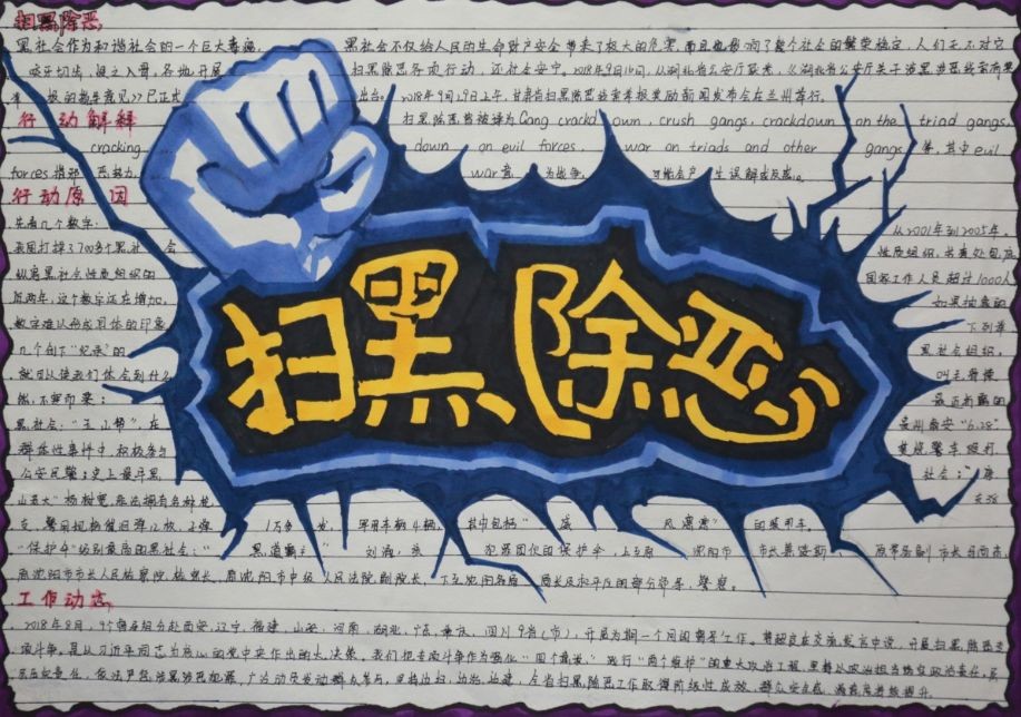 通过宣传,全县中小学生对扫黑除恶专项斗争有了更深刻的认知,一个个“宣传小能手”也随之诞生。同学们纷纷以“扫黑除恶,预防欺凌”为主题,精心绘制了718幅主题手抄报,一幅幅手抄报生动有趣,图文并茂,彰显了同学们向黑恶势力宣战的坚定决心。