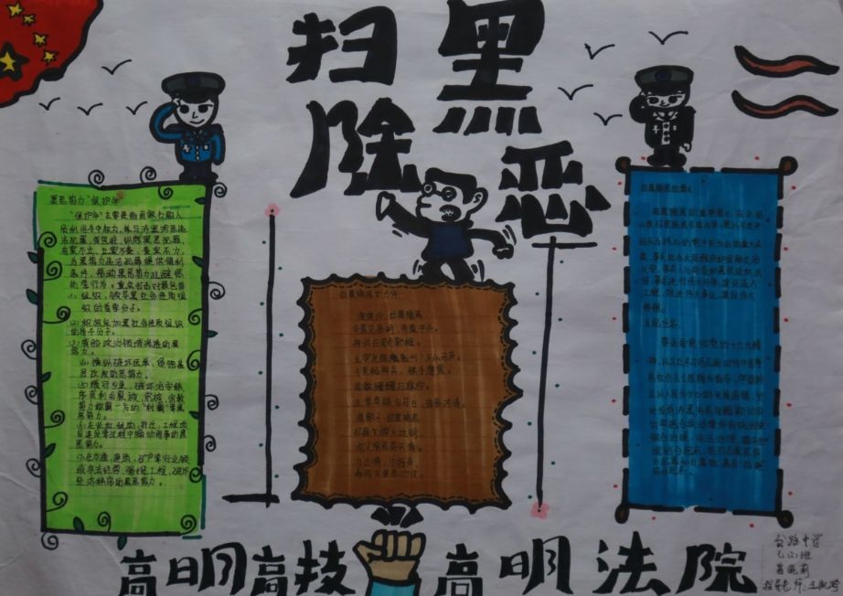 孙同学:扫黑除恶,全民有责。我希望通过手抄报的形式,让大家认识到黑恶势力的危害,提高自我防范意识。在这里,我呼吁:让我们行动起来,从我做起,维护好自身安全,积极传播勇于同违法犯罪行为作斗争的正能量。