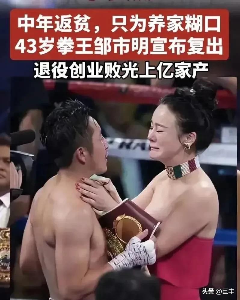 传闻宣称,43 岁的邹市明由于创业失利,致使家庭陷入经济窘境,不得不于中年之际重返拳坛,依靠打拳来维系生计、供养家庭。这一消息恰似一颗威力巨大的炸弹,瞬间在网络上迅猛扩散,引发了众多网友的密切关注和热烈讨论。