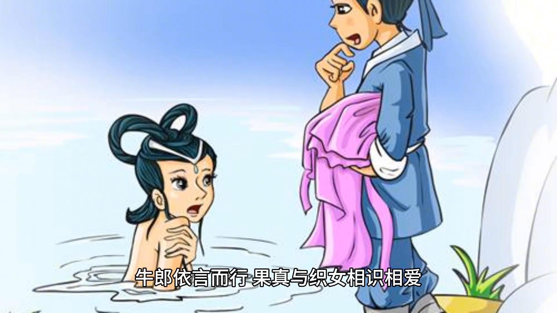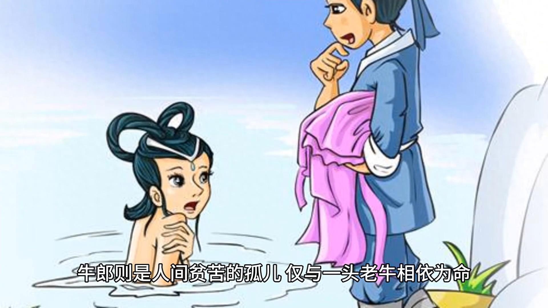 传说中织女是天上能织出绚丽云彩的仙女,牛郎则是人间贫苦的孤儿,仅与一头老牛相依为命。一日老牛突然开口告知牛郎若在湖边见仙女洗澡,藏起红色仙衣,穿此衣的仙女会成为他的妻子。牛郎依言而行,果真与织女相识相爱,二人结为夫妻,过着男耕女织的美满生活,还育有一儿一女。