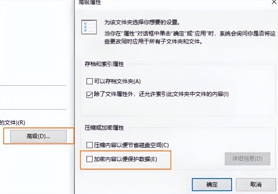 在“高级属性”窗口中勾选“加密内容以保护数据”,点击“确定”。