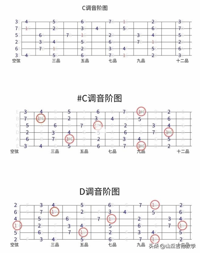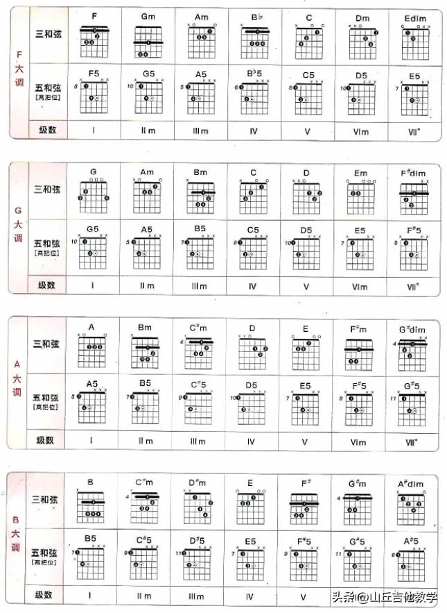 吉他十二个调音阶指板图!吉他各调和弦指法图与和声级数