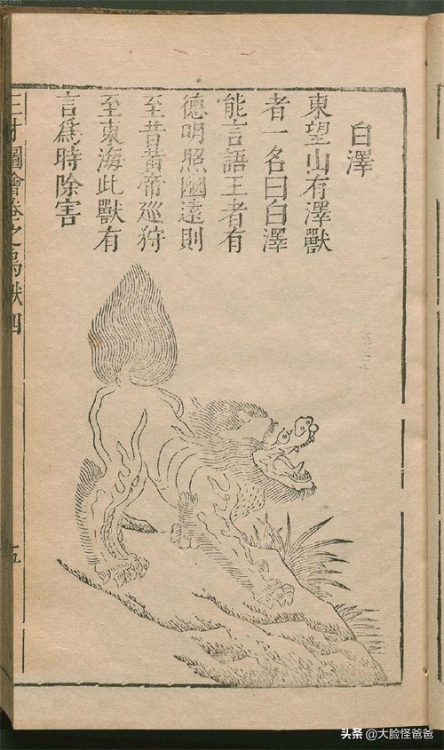 明朝的《三才图说》对白泽的外貌有过描述,说这个神兽是麒麟的身子,头上生有两角,长着山羊一样的胡子。
