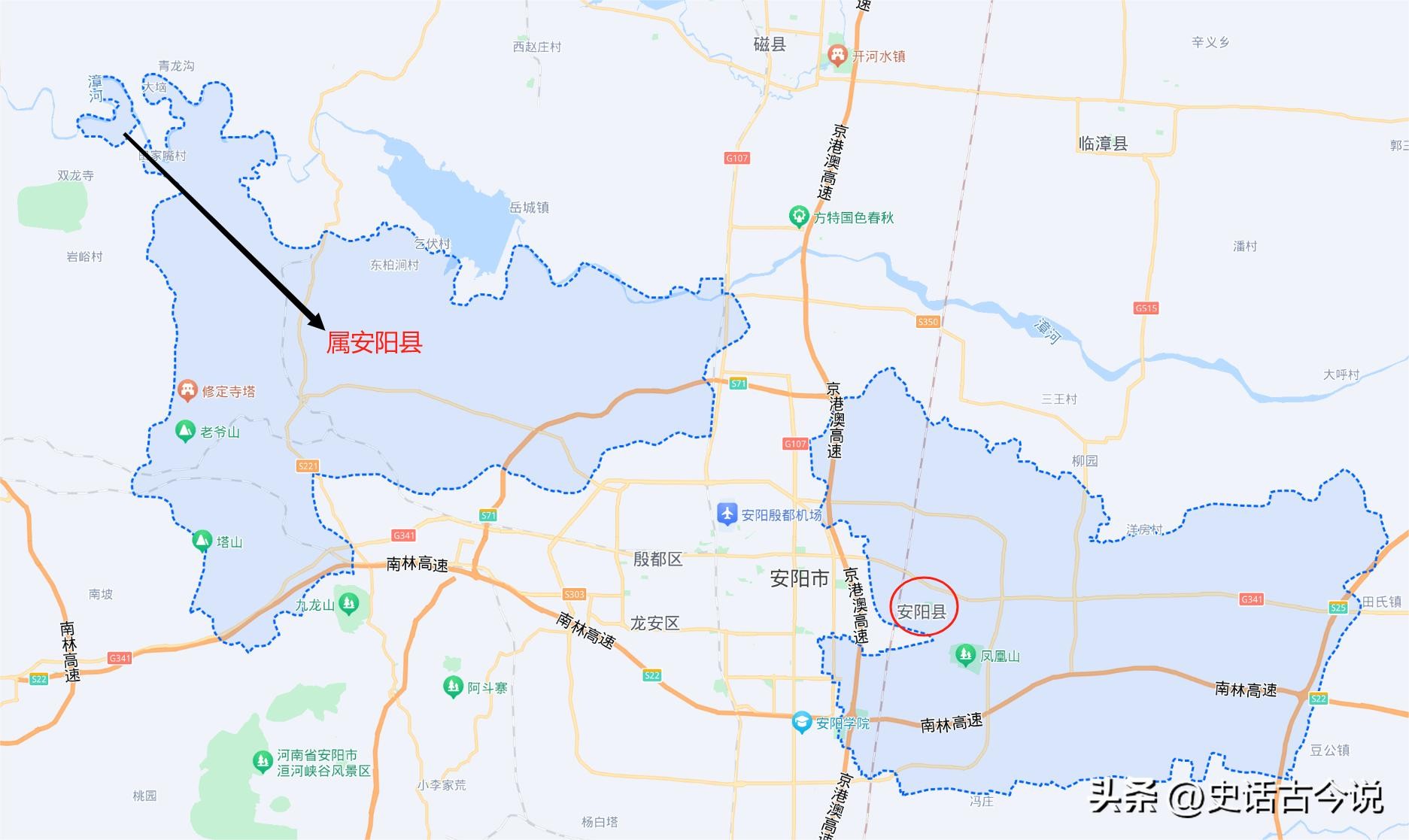 安阳县取安定、兴旺之意,县制始于秦朝属邯郸郡,西汉时建制被废拆分为荡阴县、内黄县和邺县,曹魏时为邺城所在地,两晋南北朝时后赵、前燕、东魏先后迁都于此,隋朝时以安阳城为治所复置安阳县。1949年从安阳县划出安阳城及四关置安阳市,1954年安阳、邺县重新合并为安阳县。