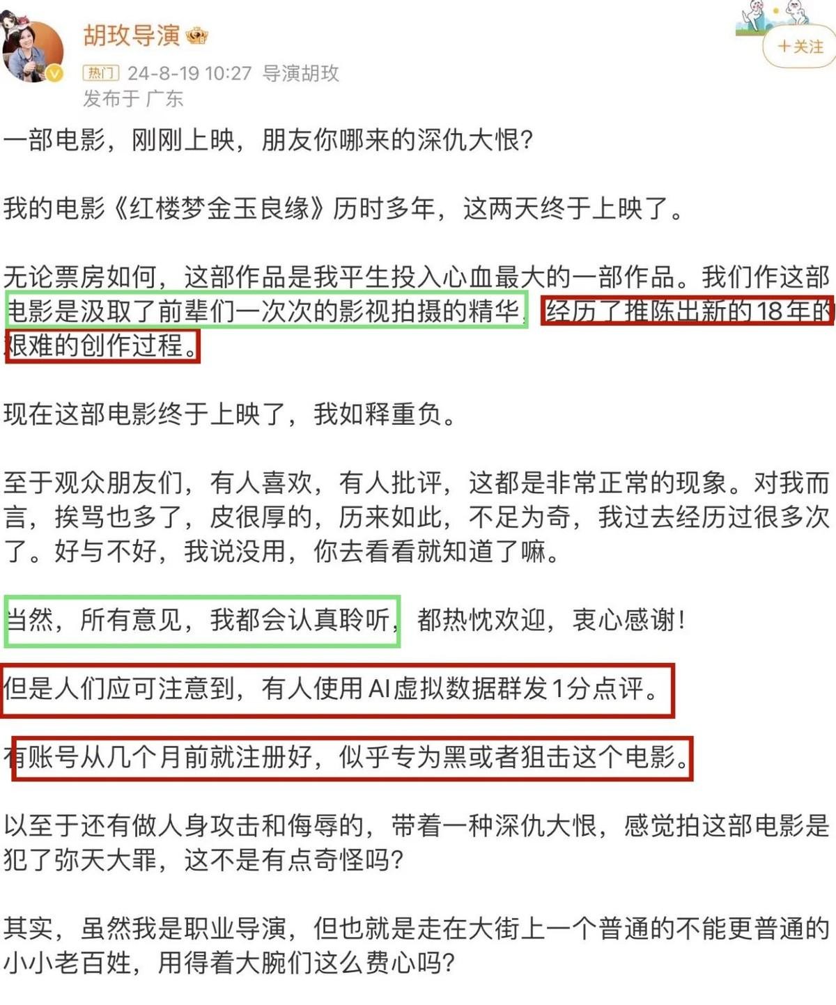 对于这样的情况,胡玫也十分的愤怒,她直接在社交平台上怒斥网友,还痛骂一顿,认为自己的电影遭到了无端的抹黑,这部电影的质量并不差,是有人故意黑她。
