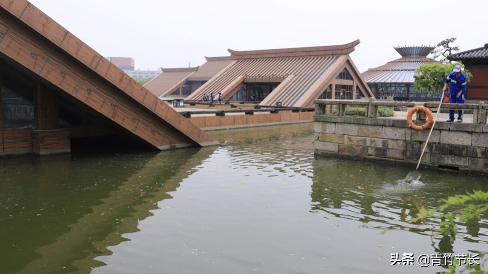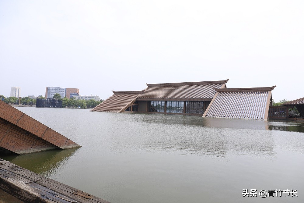 广富林文化遗址是一个水下博物馆。博物馆的建筑屋顶露出水面,咖啡色的屋顶以及三角型的造型设计很有时代特点。