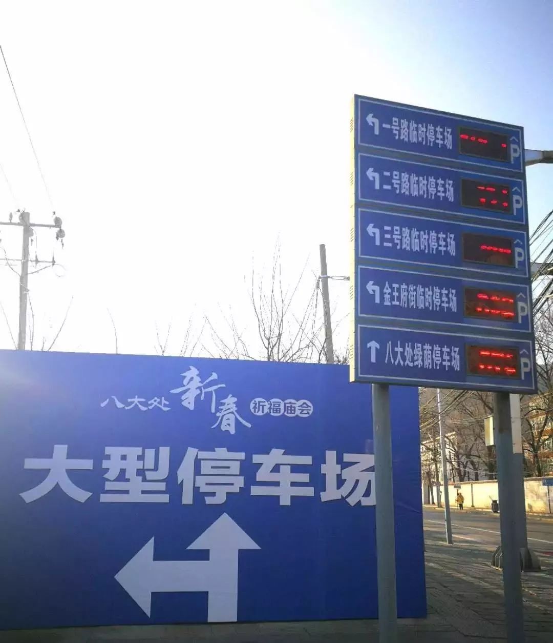 为便于游客停车,将在八大处周边设置五个停车区域,提供3467个停车位。服务时间:2019年2月4日(除夕)20:00至2019年2月10日(初六)19:00,2019年2月19日(十五)7:00至19:00;同时通过停车诱导系统,实时显示停车场剩余车位数。