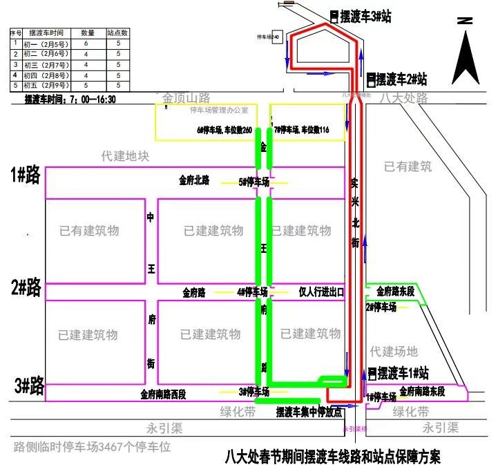 摆渡车具体运营路线由下图所示:始发站在金府南路西段东,摆渡车由始发站出发,经由实兴北街上行,由八大处山门牌楼进入八大处路上行,途经八大处停车场左转进入八大处路直下行至八大处牌楼(红绿灯),下直行进入实兴北街西,在金府路交叉口停靠摆渡车站,在金府南路与实兴北街交叉口掉头。