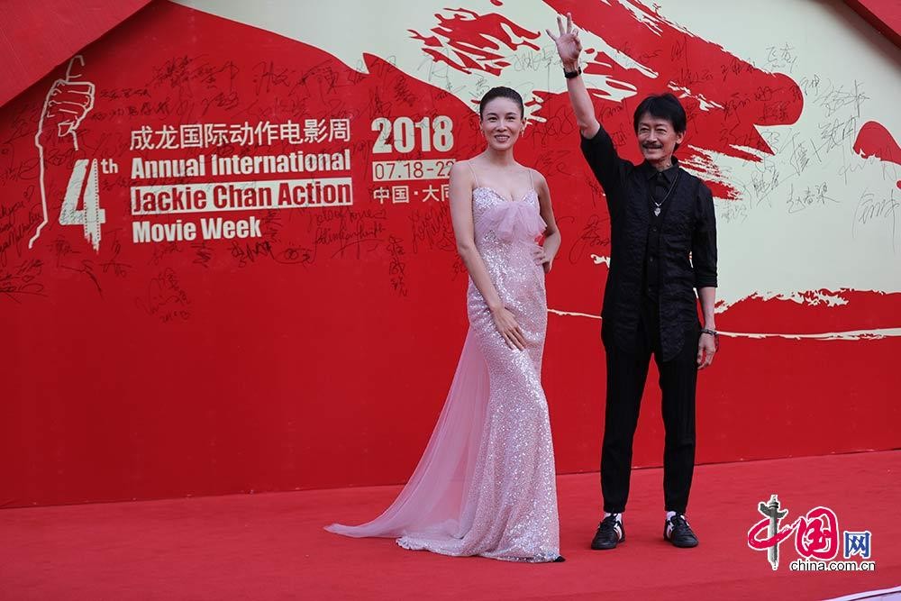 7月22日,第四届成龙国际动作电影周在大同闭幕。图为功夫女星张蓝心和香港导演陈勋奇出席闭幕红毯。中国网 董宁摄影