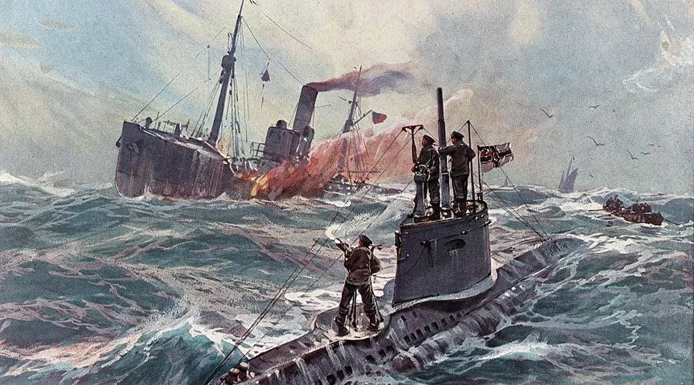 1914年10月,德国潜艇U-17在挪威南部海域击沉900吨级的英国货轮“格里特拉”号,这是战争中德国潜艇首次击沉商船,从此后击沉商船成为德国潜艇的首要目标。