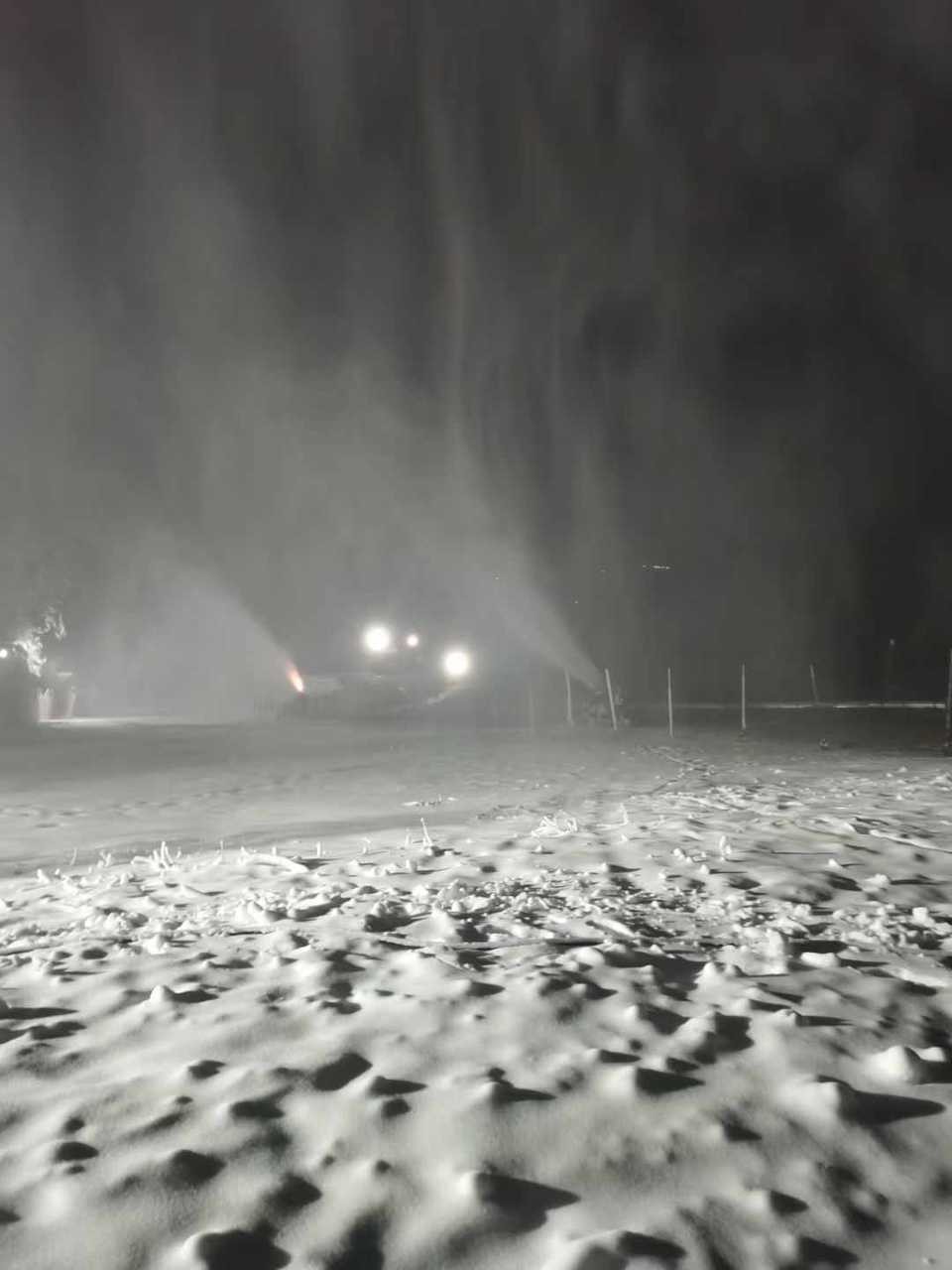 7日夜,金象山滑雪场6台造雪机开足马力,为8日试营业做最后冲刺,受访者供图。