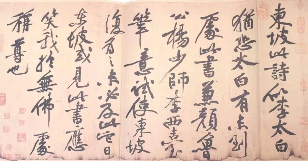 我们如今所见题跋墨迹原作以宋代为早,如黄庭坚在苏轼《黄州寒食帖》后所题的跋,云:“东坡此诗似李太白,犹恐太白有未到处。此书兼颜鲁公、杨少师、李西台笔意,试使东坡复为之,未必及此。它日东坡或见此书,应笑我于无佛处称尊也。”这段跋是黄庭坚在苏轼尚在人世时所写,属于同时代人题的跋,对苏轼这件作品从文学、书法两方面进行了评价。有趣的是,黄庭坚此跋的字形甚至大于苏轼所书正文,并且这段题跋并没有落款。