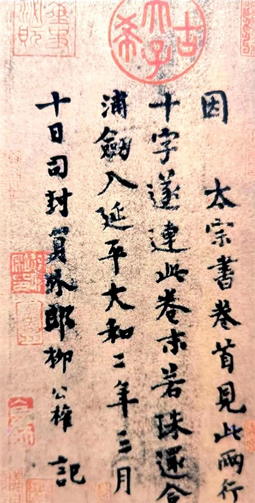 题跋,题是作品前面的标题,跋是作品后面的跋尾,现在通常也将后面的跋称作题跋,在这里我们主要介绍跋尾。有作者本人题跋、同时代人题跋和后人题跋,作用不尽相同。题跋的出现和发展余嘉锡在《古书通例》中说:“诸子之中,有门人附记之语,即后世之题跋也。”也就是说,题跋远在先秦就已经出现了,但是这显然指的是文本题跋,书画题跋的出现则很可能远在此后。在书法作品后面题写跋文在唐代已经较为常见,如王献之《送梨帖》后柳公权的跋,“因太宗书卷首见此两行十字,遂连此卷末。若珠还合浦,剑入延平。大和二年三月十日。司封员外郎柳公权记”。这件作品清代时在内府,原作已佚,幸有黑白照片流传,柳公权楷书跋风格轻松活泼,与其所书碑版拓片颇有不同,极为珍贵。