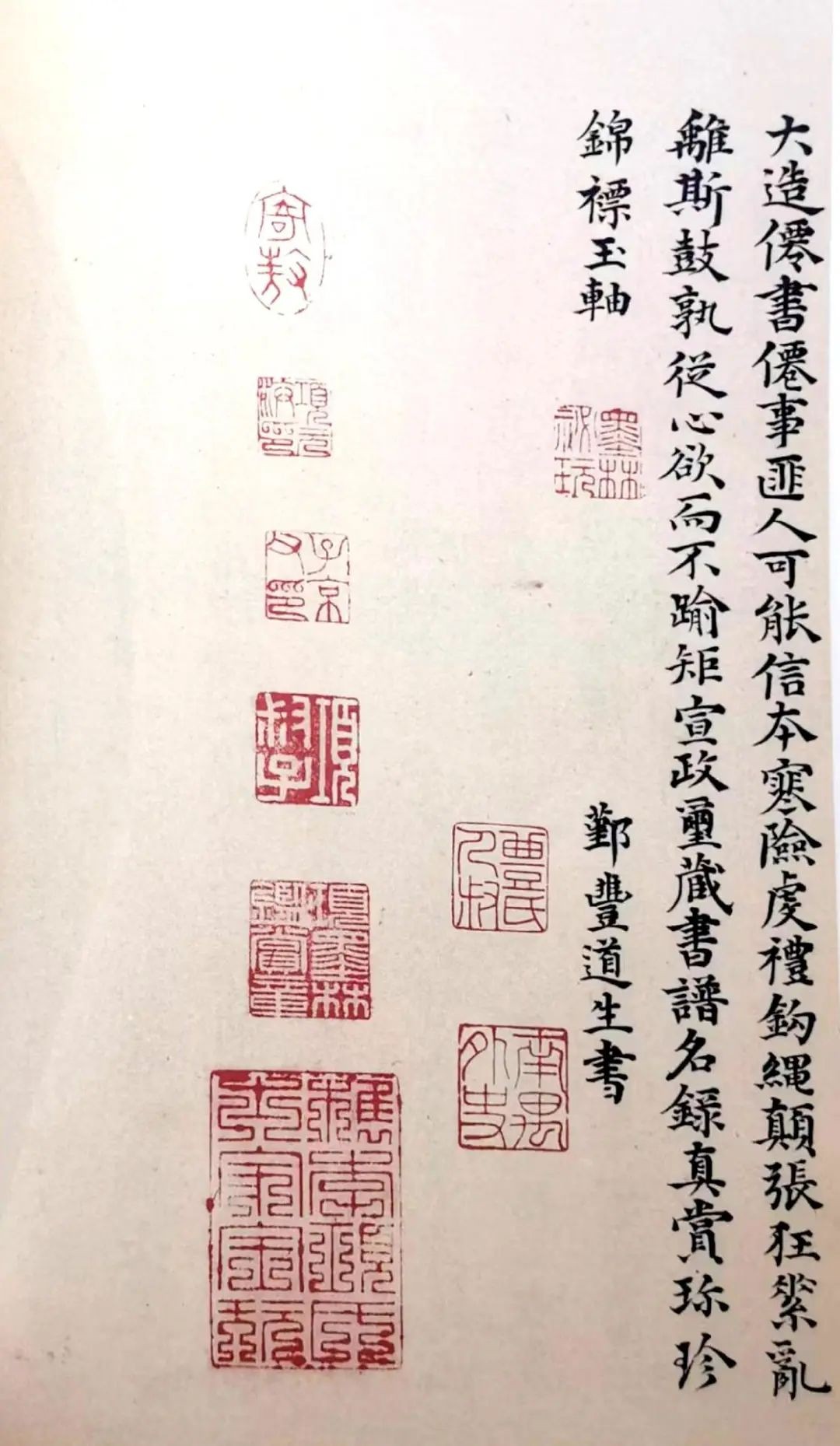 《邕禅师塔铭》三十年来所见凡五本,皆经昔贤定为唐石宋拓者,顾书势皆囫沦,与信本它碑劲健畅发者不同,心以为异。及宣统初元见敦煌石室唐拓残本,笔势全与《虞公碑》同,始知世传为范氏书楼原石本实非唐石之旧,得解往昔之疑。但唐拓残本合英法两京所藏才二百余字,则美犹有憾,且意人间不复更见它本矣。今年薄游申江,因老友赵君叔孺得识湖帆先生,出潘文勤公旧藏此本见示,甫一展观,神采焕发,精光射十步外,不必一一与《敦煌本》校量,已可确定为唐石宋拓。且存字多至九百余,为之惊喜欲狂。而册后有翁阁学跋,因与它本不同,反以此为宋人复本,以蔽于所习,致使颠倒若斯……且喜予于见唐拓后十余年又得见此原石足拓也。丙寅五月九日灯下,上虞罗振玉书。”