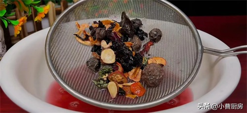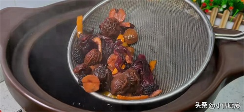 这个时候已经熬好了先将火关掉,再用密漏将里面的料渣全部捞出来,这个料渣也不要丢了,还可以进行二次利用只是味道稍微有点淡。