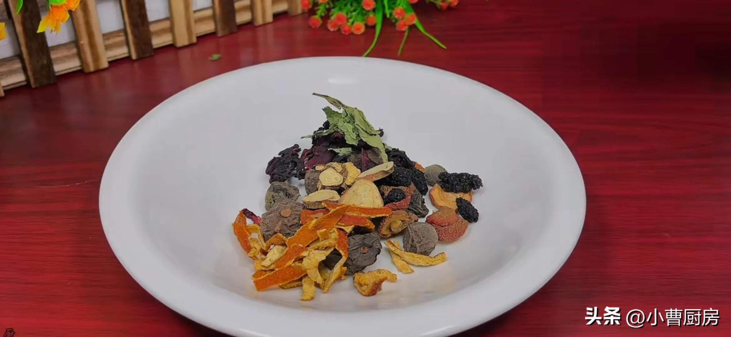 首先提前把食材准备好:乌梅28克、山楂片10克、桑葚5克、玫瑰茄5克也叫洛神花、甘草3克、陈皮5克、干薄荷叶1克,熬酸梅汤所需要的材料基本上就这么多。