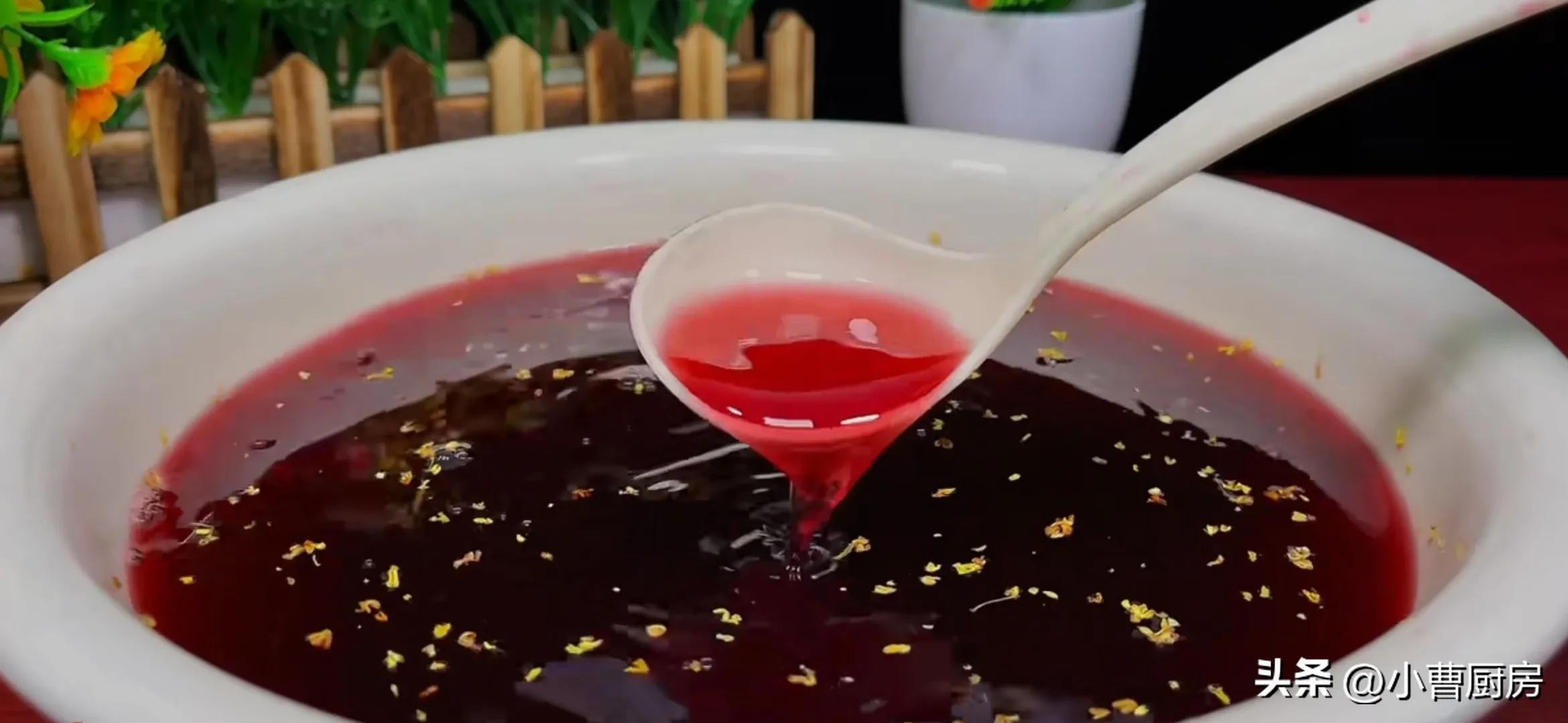 等晾至温热之后再将桂花撒在表面,桂花一定不要趁热撒,否则桂花的味道就挥发掉了。
