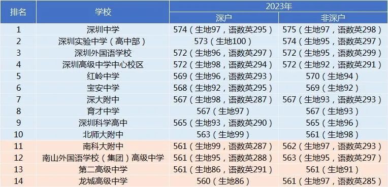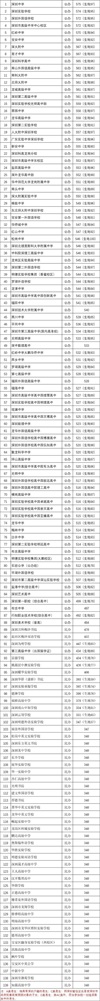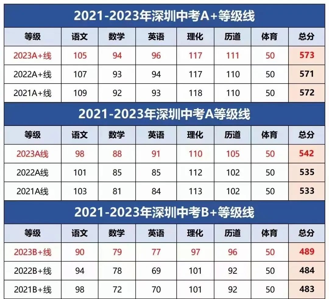 深圳这几年一直在大力发展高中教育,引进人才提升教育质量。只要能进前四十的高中,就是考进了好学校,将来高考的机会还是很多的。2023年四大排位基本稳定,高级与深外录取线相同并列第三。值得注意的是四所学校的录取线差距变得很小,2021年四大间最高尚有8分的差距,而22年、23年仅有2分之差了。从填志愿的角度来看,也可以理解为四大之间的界限变得模糊了。十大方面,红岭、宝中、深大附中、五六七的位置保持不变;育才、科高各进一位,同时稳居第八位的南外退出十大之列;北师大附中连续提升冲进十大。尖子生们所关注的四大,也要来看看十大之后的分数线变化情况。十大(北师大)、十五大(翠园)分数线整体上涨3-7分;二十大左右的深外龙华、高级东校区分数线分别上涨13分和14分,与2022年形成大幅度上涨,因此可以看出中档的学生基于今年的中考并没有那么难的情况下,竞争较2022年是大许多的。对中等档次的学生来说,每一年的竞争都是更加激烈的(人数比例更加集中)。第四梯队的南头中学较2022年上涨11分,华侨城中学(南山范围的保底校)较去年上涨13分。新学校北理莫斯科大学的对外招生吸引力似乎不错,让这所新学校在今年处在了众多学校中的中等偏上地位。提示一下,新学校一定要综合考虑,关注地点、所在地理位置、管理团队和师资情况。2023年A线(25%)是542分,也就是罗湖外国语和中科院附属高中所在的分数线。从第五梯队开始,学校较2022年上涨15-30分,甚至后部学校有增加40分的情况。2022年四大开始开办高中园,2022年出现345分高中园最低分数线的情况实属录取标准的失误,至少要把高中园考虑在500分的范围。今年分数线发布我发现深圳中学的高中园以最高分528位列各高中园之首。公办普高最低分依旧落在布吉中学(第三高级出国班我们暂时不算作考虑),仅次于上面的是第二高级深汕实验。
